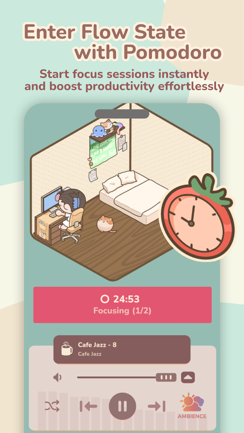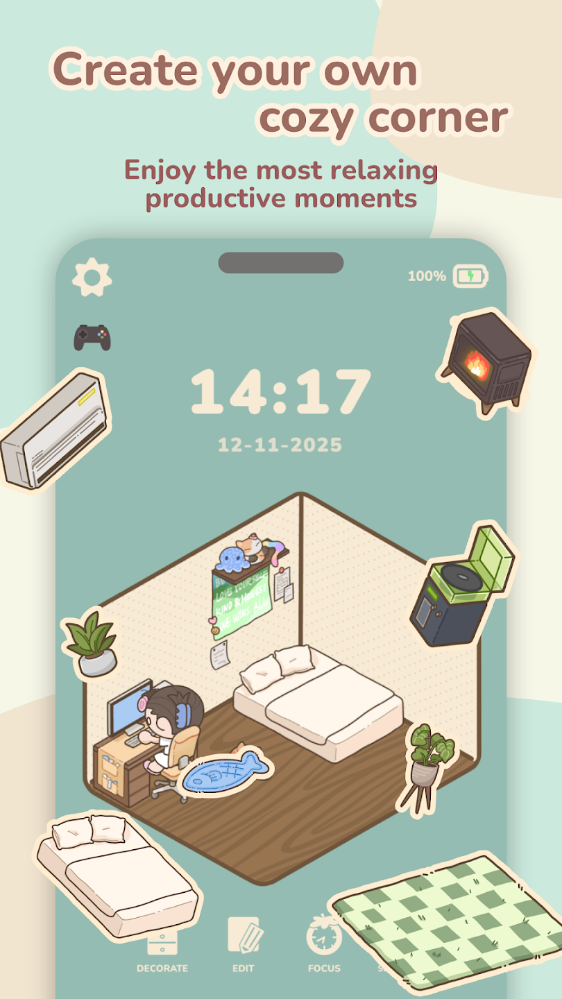 Different furniture pieces trigger default animations to activate key features like the tomato timer and focus mode.