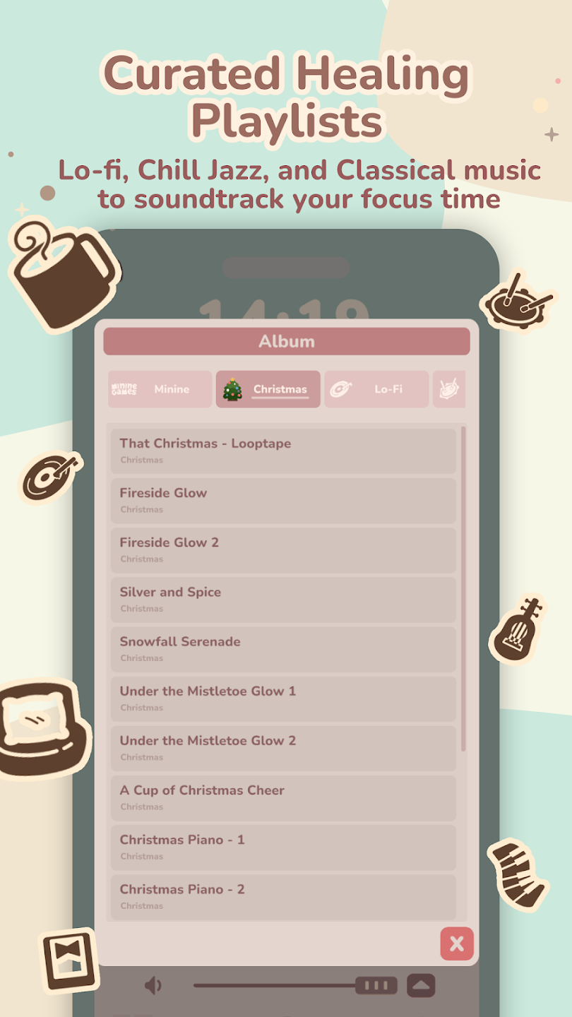 Gentle background music and ambient sounds help you relax, focus, or unwind.